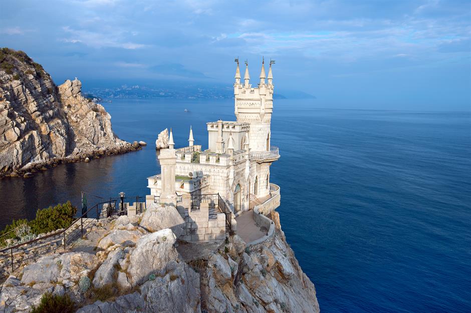 A marvel of engineering, the Neo-Gothic Swallow’s Nest cathedral teeters on the edge of the Cape-Ai-Todor cliff above the Crimean Sea, with parts of the structure extending beyond the cliff face. Situated just outside the town of Gaspra on the Crimean Peninsula, the castle was built in 1912 for a wealthy German oil baron. In this stunning shot, the fairy tale castle surges out into the ocean, looking almost as if it might topple over at any moment.