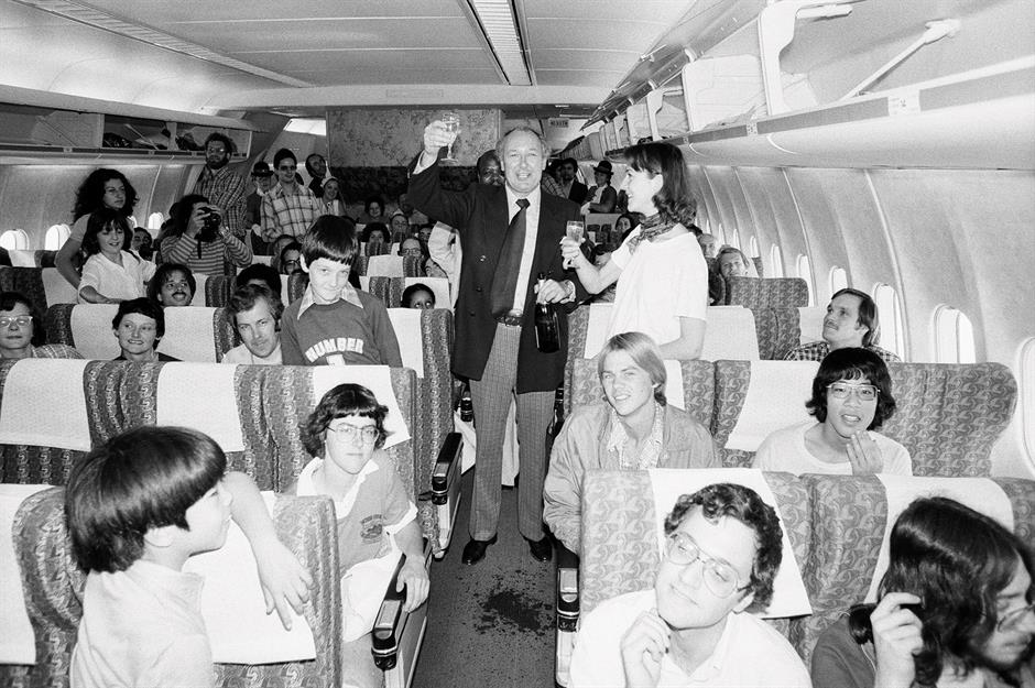 Here we see Laker mingling with passengers on board his transatlantic Skytrain service from London to New York in 1979, whose affordable tickets saw many members of the public take their first flights. The airline eventually failed, but it birthed the budget flying industry that continues to flourish to this day.