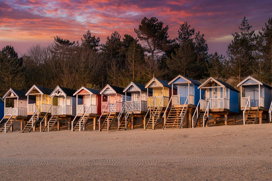 Flanked by pine forests and wide expanses of golden sand, Wells-next-the-Sea is one of Norfolk’s most beloved seaside towns. Its beach is famous for its long line of colourful, elevated beach huts and sweeping views that stretch across Holkham Bay.