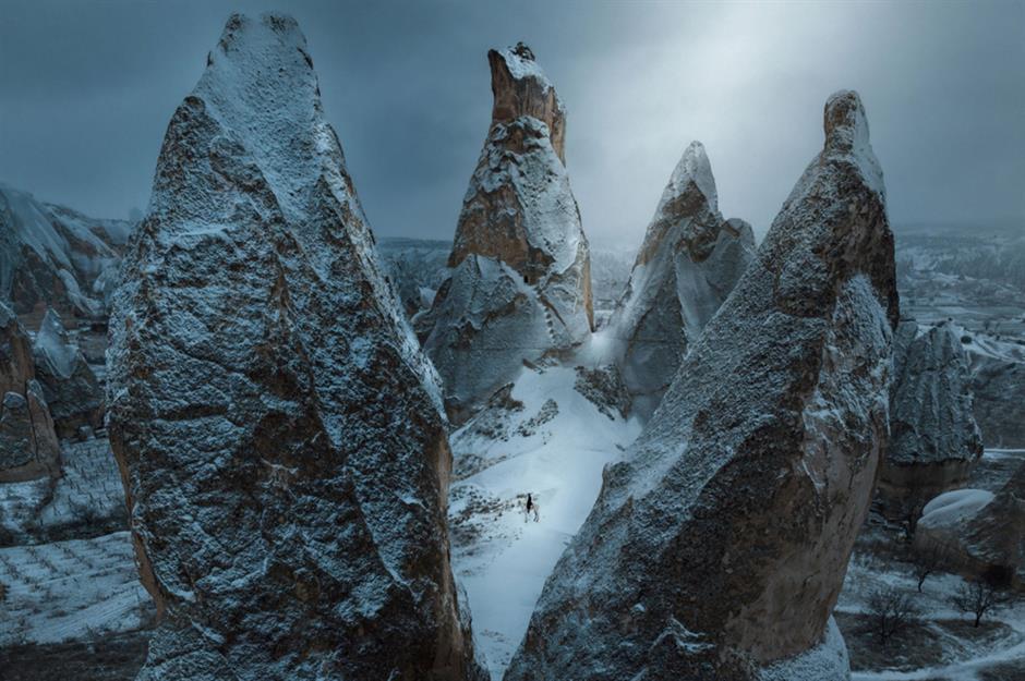 Taken during the magic of blue hour in a bleak Turkish winter, this photo of a lone rider standing atop a rocky outcropping in the heart of Cappadocia was declared Photo of the Year in the 2025 Drone Photo Awards.