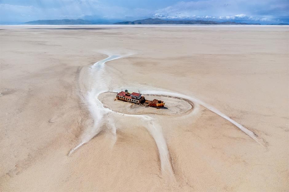 The Artemia pleasure boat stands marooned in the dried bed of Lake Urmia, Iran – a sobering testament to the impact of climate change on this part of the world.