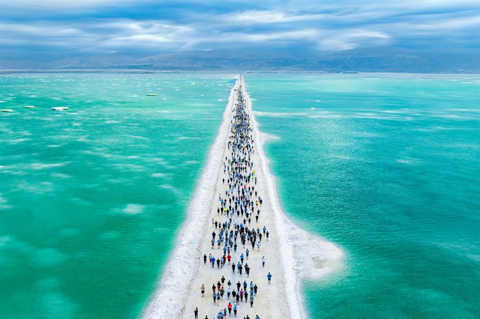 Captured during the Dead Sea Marathon, this beguiling photo sees runners push forward as the first light of dawn breaks over the Dead Sea.