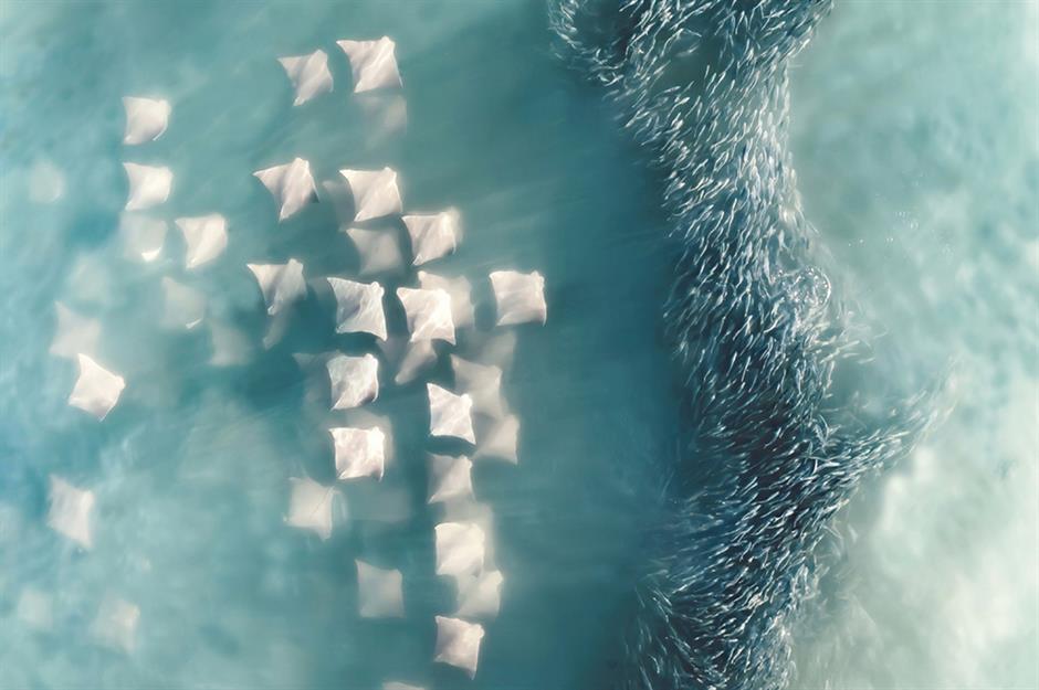 This stunning photo captures a fever of cownose rays dividing a school of menhaden fish.