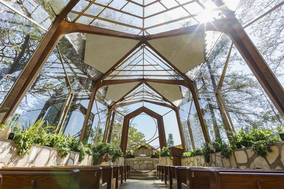 The historic Wayfarers Chapel in southern California is the best-known work of American architect Lloyd Wright (son of Frank Lloyd Wright), and was completed in 1951. Surrounded by towering redwoods, the church was a popular wedding venue, and Jayne Mansfield married fellow film star Mickey Hargitay here in 1958.