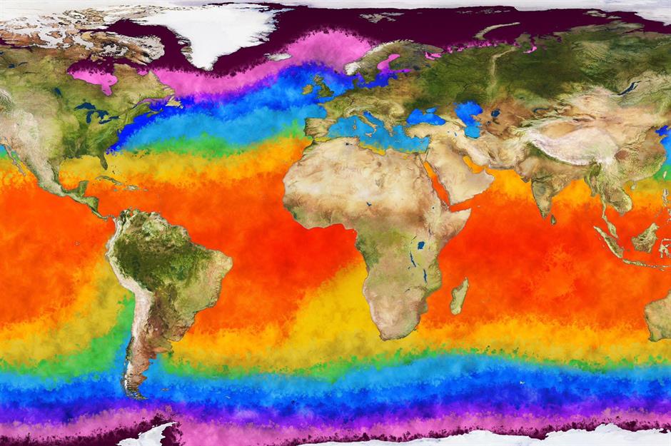 Die Welt muss sich in den kommenden zwei Jahren auf neue Temperaturrekorde einstellen. Das geht aus einer Prognose der Weltwetterorganisation (WMO) hervor, die für dieses Jahr die Rückkehr des Klimaphänomens El Niño voraussagt. Die Wahrscheinlichkeit, dass sich ein El Niño entwickelt, liege für die Monate Juni bis August bei 70 und für Juli bis September bei 80 Prozent, teilte die WMO mit. El Niño erhöht die globale Durchschnittstemperatur und erwärmt das Wasser des Pazifischen Ozeans. Dieses Bild zeigt die unterschiedlichen Temperaturen der Meeresoberfläche auf der ganzen Welt.
