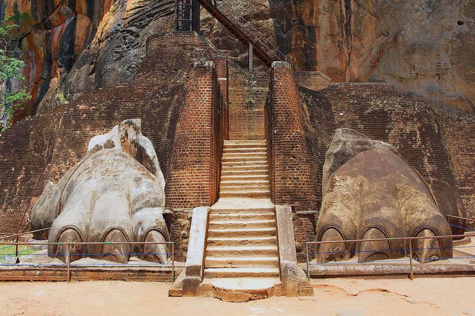Sigiriya leitet sich vom Wort „Singha Giri“ ab und bedeutet „Löwenfelsen“. Denn der Eingang der Stadt wird von einer riesigen Löwenstatue bewacht, von der heute allerdings der Kopf fehlt. Sigiriya wurde auf einem Monolith 200 Meter über dem Dschungeldach errichtet, ursprünglich als buddhistisches Kloster im 3. Jahrhundert v. Chr. 800 Jahre später baute König Kassapa darauf eine opulente Festung mit einem Palast. Dieser war von Gärten, Teichen und einer Spiegelwand umgeben.