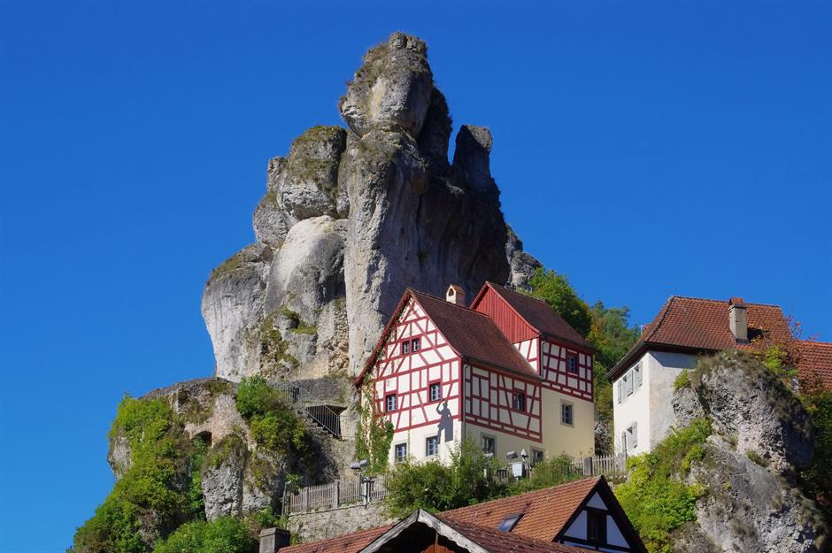 Wäre das fränkische Fachwerk nicht Teil dieser Häuser, könnte man das bayerische Tüchersfeld auch mit den Felsenklöstern von Meteora in Griechenland verwechseln. Die traditionellen Gebäude des malerischen Örtchens in der Fränkischen Schweiz, das im Mittelalter eine Obere und eine Untere Burg hatte, verstreuen sich rund um einen markanten Felsen.