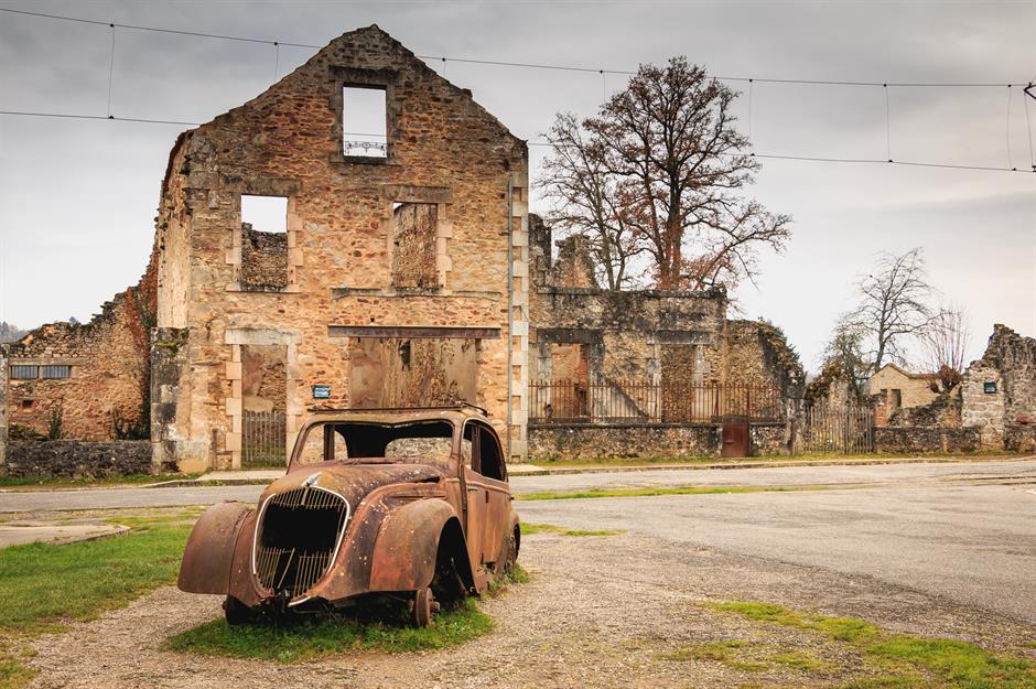 Die verwitterten Ruinen dieses Dorfes in der französischen Region Limousin sind nahezu unberührt geblieben, um an die Gräueltaten des Zweiten Weltkriegs zu erinnern. Im Juni 1944 verübte die SS ein schreckliches Massaker auf Oradour-sur-Glane. Die Bewohner wurden in der Dorfkirche und den Scheunen zusammengepfercht und brutal ermordet. 642 Menschen starben an jenem düsteren Tag, darunter viele Frauen und Kinder. Die Häuser brannten nieder.