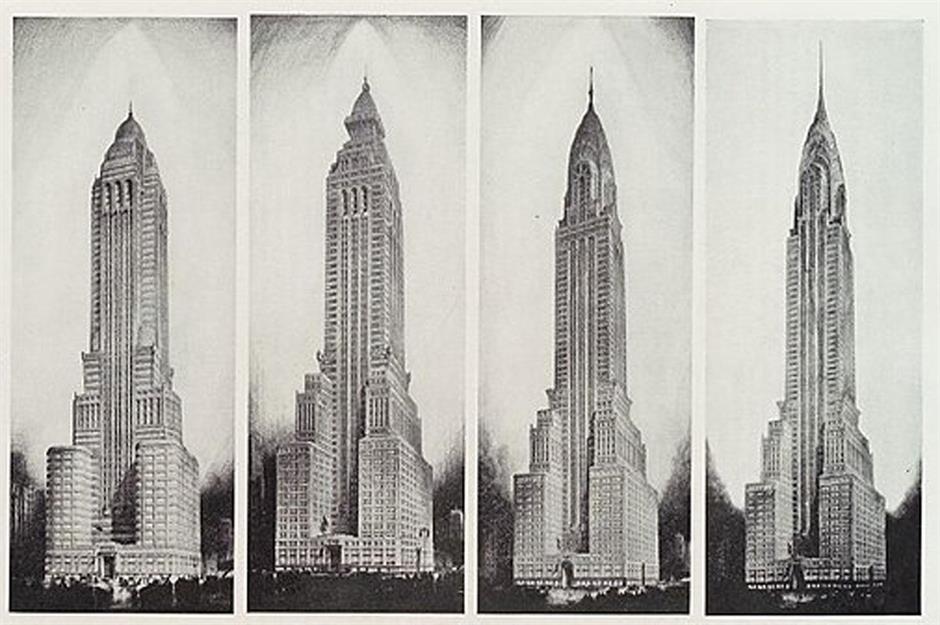 Diese Bilderreihe zeigt faszinierend, wie Van Alen den Entwurf schrittweise bis zur Endfassung weiterentwickelte. Der New Yorker Architekt hatte gleich mehrere Ideen für die Krone des Wolkenkratzers, bevor er sich schließlich für die Terrassenversion entschied, die wir heute kennen.