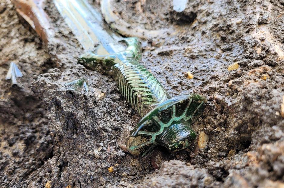 In einem 1.600 Jahre alten Grabhügel in der Nähe der japanischen Stadt Nara fanden Forschende ein knapp 2,30 Meter langes Schwert. Wegen ihrer gigantischen Größe kam die Waffe wohl nie in einer Schlacht zum Einsatz, sondern soll laut Meinung der Archäologinnen und Archäologen einen zeremoniellen Zweck zur Abwehr böser Geister gehabt haben. Bei dem kunstvoll verzierten Objekt handelt es sich um ein sogenanntes Dakō, dessen Klinge in wellenförmigen Linien geschwungen ist. Das entdeckte Schwert stammt aus der frühen Kofun-Periode (250 bis 538 n. Chr.), einer Epoche, die für ihre großen Grabhügel zum Schutz der Verstorbenen der herrschenden Klasse bekannt war.