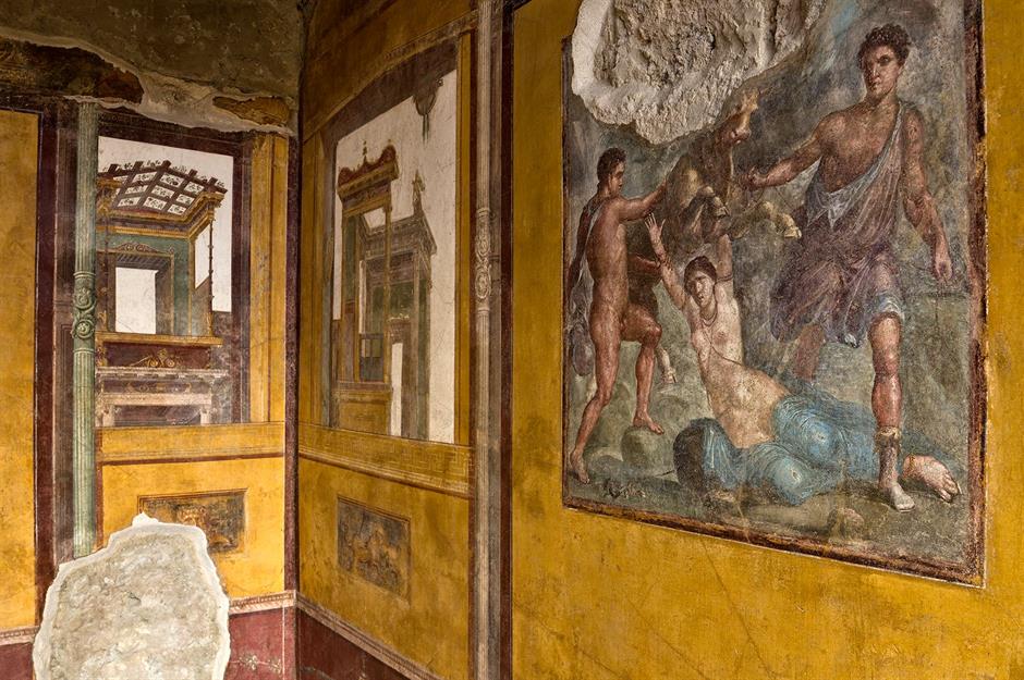 Zu den jüngsten Entdeckungen von Pempeji gehören auch zwei mit Fresken verzierte Wände, von denen eine die olympische Gottheit Apollo und die Meeresnymphe Daphne zeigt. Die andere stellt den Meeresgott Poseidon und Amymone dar, eine Prinzessin aus dem Mittelmeerraum. All diese Funde kamen bei Ausgrabungen in der Regio IX. zum Vorschein, der zentralsten der neun Regionen, in die Archäologen die antike Stätte aufgeteilt haben.