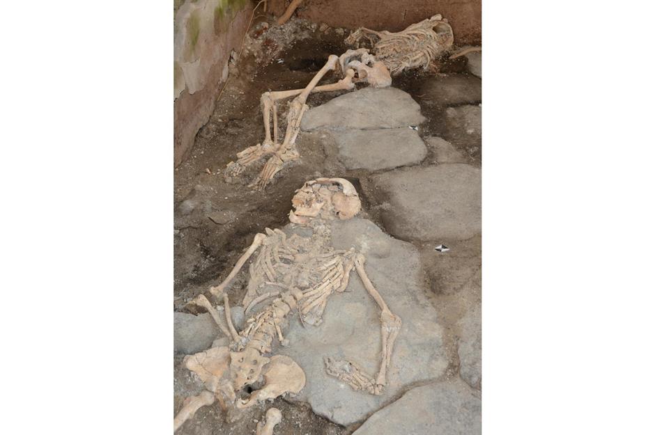 In der archäologischen Stätte von Pompeji sind die Überreste von drei Menschen in den Ruinen einer Bäckerei entdeckt worden. Experten gehen davon aus, dass die zwei Erwachsenen (vermutlich weiblich) und ein Kind dort Schutz vor dem berühmtberüchtigten Vulkanausbruch suchten, der die Stadt am Fuße des Vesuvs vor rund 2.000 Jahren verschüttet hat.