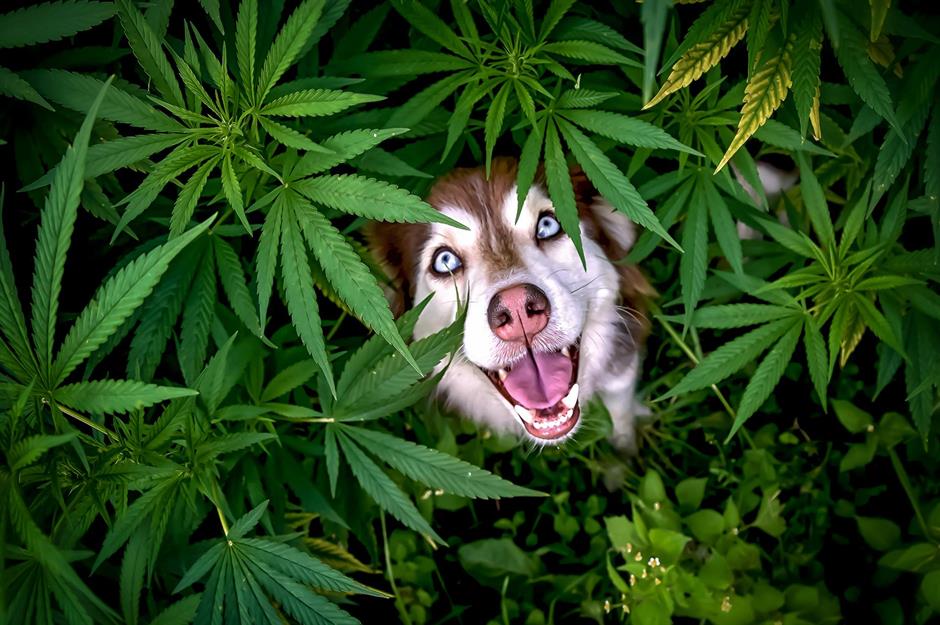 Erwischt! Diese verspielte Hündin lugt aus den Blättern des Nutzhanfs und kann sich ein verschmitztes Grinsen dabei nicht verkneifen.