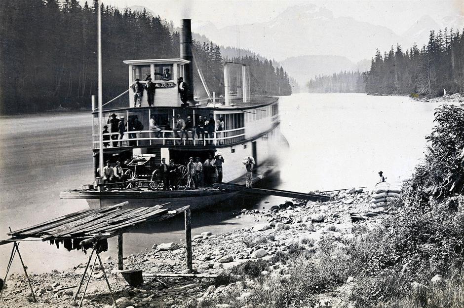 The founding of British Columbia as a colony was also quickened by the arrival of the Americans. When gold deposits in the region had been depleted by the mid-1860s, the colony fell into a recession – this photo captures the Gold Rush town of Soda Creek in 1863.