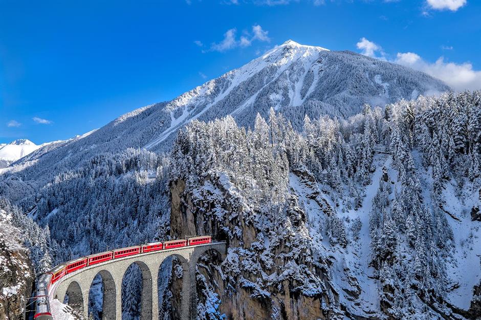 Die Fahrt mit dem Glacier Express, der die zwei Skigebiete Zermatt und St. Moritz verbindet, bietet einige der schönsten Aussichten auf die Schweizer Alpen. Die Panoramaroute führt über den Oberalppass, den höchsten Punkt der Strecke, und das Landwasserviadukt (im Bild), eine 65 Meter hohe Sechs-Bogen-Brücke. Auf der eintägigen Fahrt geht es durch 91 Tunnel und über 291 Brücken. Fahrgäste bekommen idyllische Bergwiesen, Seen und Almhütten zu sehen.