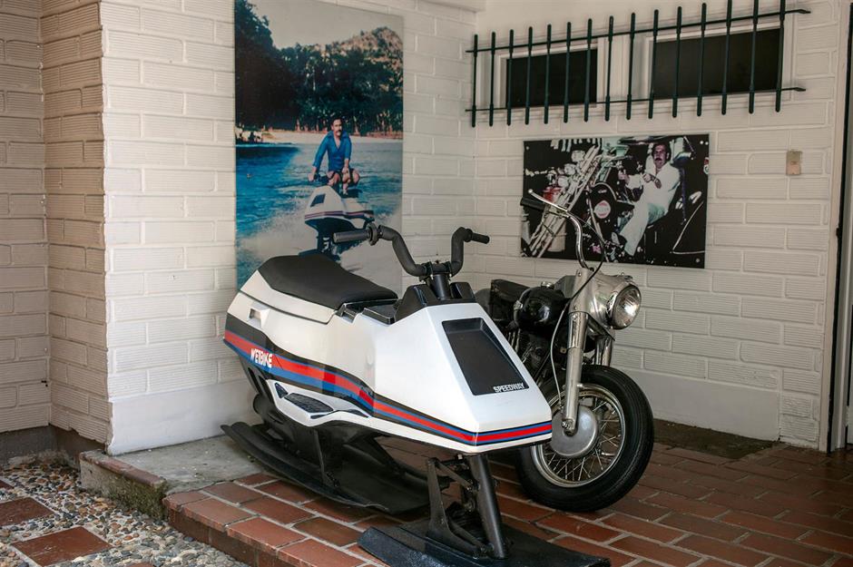 Zu den Kuriositäten des Museums gehörte dieses skurril anmutende Wetbike. Die Mischung aus Motorrad und Jetski kam in den 1980er- und 1990er-Jahren kurzzeitig in Mode, nachdem Roger Moore 1977 im James-Bond-Film „Der Spion, der mich liebte“ auf einem solchen Gefährt unterwegs war. Ein weiteres Highlight der Sammlung ist ein Gemälde von Roberto Escobars wertvollem Paso-Fino-Hengst Terremoto („Erdbeben“). Das Tier wurde 1993 von einer rivalisierenden Drogenbande entführt und kastriert. Laut dem Nachrichtensender „BBC Mundo“ ranken sich in der Welt des Pferdesports einige Legenden um den berühmten Hengst. So soll er beispielsweise von der texanischen Tierklonfirma ViaGen Pets geklont worden sein.