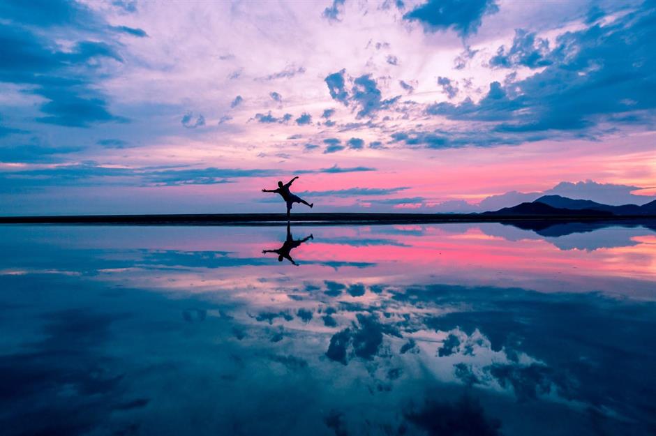 Wer nach einem Regenschauer den Salar de Uyuni, die größte Salzebene der Welt, betritt, scheint über das Wasser gehen zu können. Tatsächlich bedeckt zwar nur eine flache Wasserschicht die Ebene, aber die Spiegelung des Himmels darin scheint alle Grenzen zu verwischen. Auch, wenn es nicht geregnet hat und das weiße Salz wie eine Mondlandschaft aussieht, wirkt die Salzebene wie von einer anderen Welt.