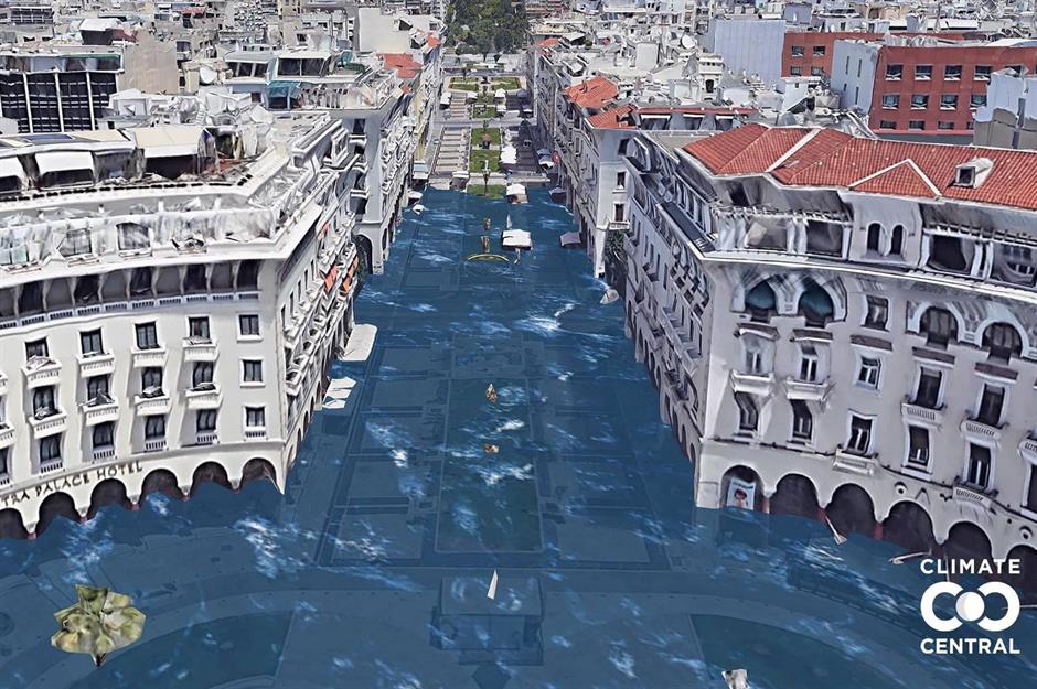 Der Aristoteles-Platz in Thessaloniki mit seinen neoklassizistischen Gebäuden und schönen Gartenanlagen ist eine der am meisten besuchten Sehenswürdigkeiten in Griechenland. Die gepflegten Grünflächen und schattigen Fußwege würden unter Wasser stehen, wenn sich das Klima um drei Grad erwärmt.