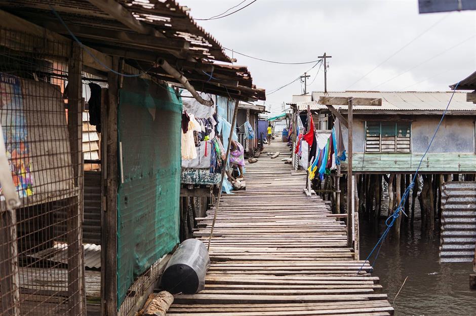 Einem Bericht der Weltbank zufolge leben über 70 Prozent der Einwohner in informellen Siedlungen und haben keinen Zugang zu sauberem Wasser und sanitären Einrichtungen. Die Gemeinde Makoko, das sogenannte „Venedig der Slums“, entstand im 19. Jahrhundert als Fischerdorf. Mittlerweile ist sie ein weitläufiger Slum mit 300.000 Einwohnern, die auf Stelzenhäusern in einer verschmutzten Lagune leben, wo sie arbeiten, zur Schule gehen und Waren per Boot vom und zum Festland transportieren.