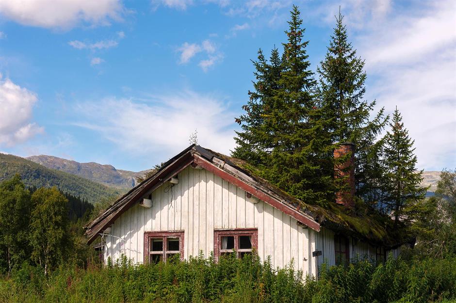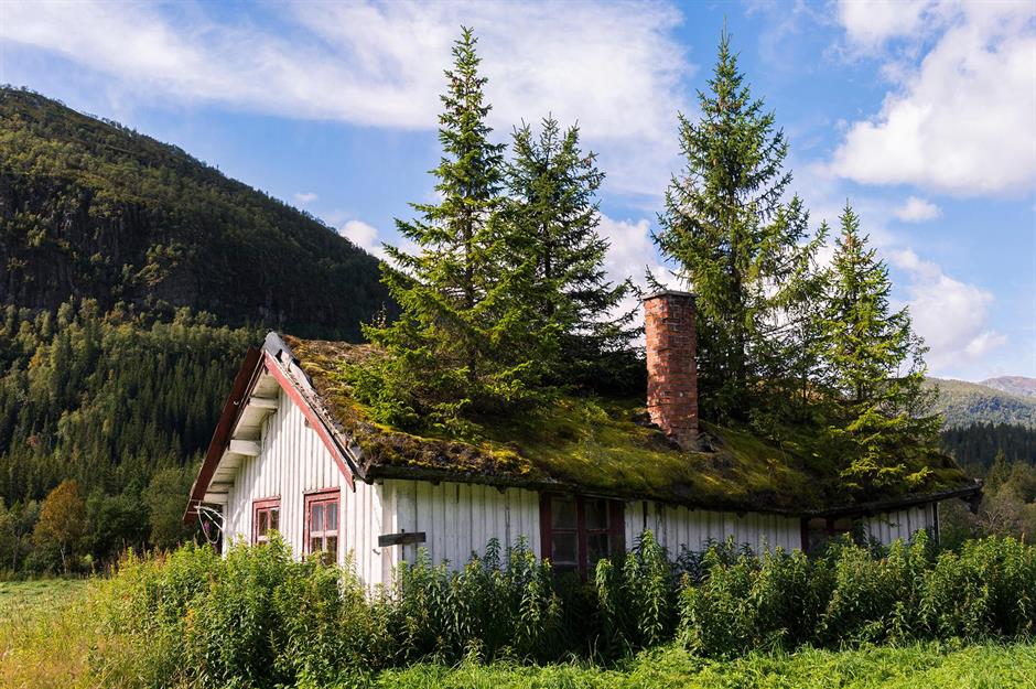 Rustikale Bauernhäuser mit Torfdächern sind auf dem Lande in Norwegen häufig zu sehen, aber meist sind sie nicht so überwuchert wie dieses Prachtexemplar in Hemsedal.