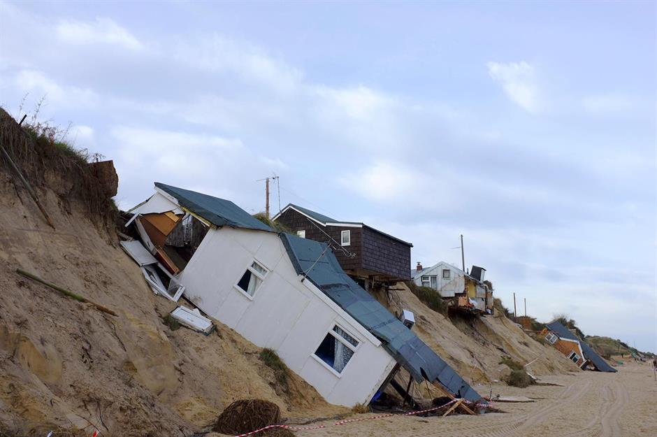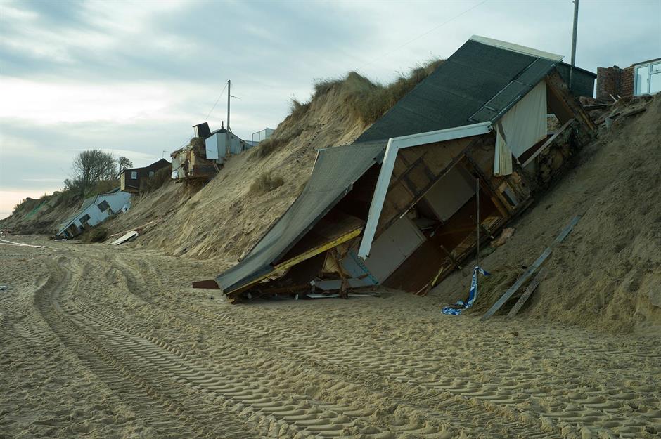 Diese Häuser in Hemsby, gelegen im Südosten von England, stehen direkt an einem der Küstenabschnitte, die stark von Erosion betroffen sind. Als der Ort 2013 dann von einem der schlimmsten Stürme der Geschichte heimgesucht wurde, hatten sie keine Chance. Sieben Häuser wurden komplett zerstört und zahlreiche weitere schwer beschädigt.