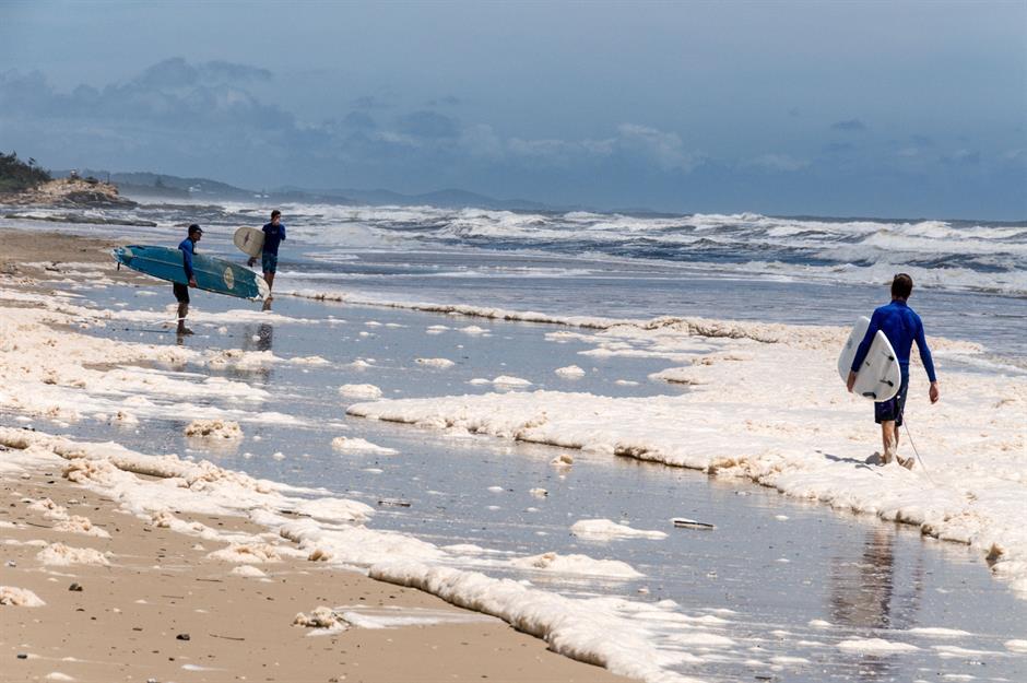 Australier sind an ungewöhnliche Phänomene an ihren Stränden gewöhnt, vor allem im tropischen Queensland. So bildet sich im Nordosten von Down Under zu bestimmten Jahreszeiten zum Beispiel häufig ein dicker Teppich aus Gischt, der an Seifenschaum erinnert. Der Schaum entsteht vor allem bei Sturm, wenn Algen und andere organische Stoffe im Wasser aufgewirbelt werden. Im März 2017, als im Pazifik ein Zyklon wütete, mussten mehrere australische Strände wegen der weißen Schaummassen gesperrt werden. In einigen Küstenorten schien es sogar zu schneien, weil der Schaum durch die Luft wirbelte.
