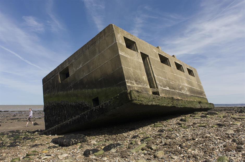 Dieser Bunker wurde zwar nicht direkt angespült, doch ist er das Ergebnis von Küstenerosion und ein ziemlich eigenartiger Anblick an einem Strand. Der Betonbunker auf der Isle of Sheppey war einer von vielen, die im Zweiten Weltkrieg im Süden Englands errichtet wurden.