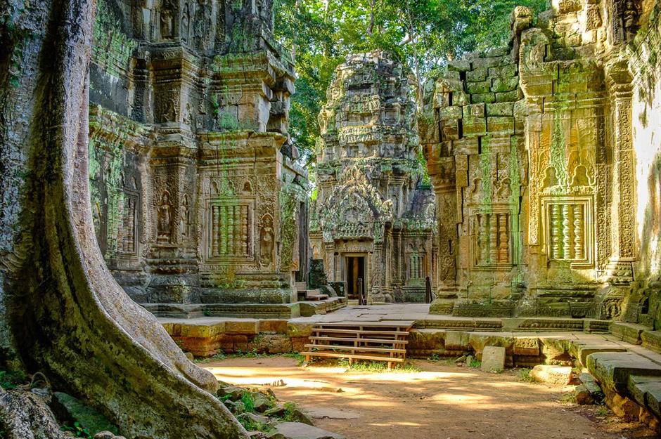 Am Eingang zum Tempel Ta Prohm, der für König Jayavarman VII. errichtet wurde, befindet sich ein riesiger Buddhakopf – der möglicherweise sogar den König selbst darstellen soll. Doch Ta Prohm verfiel zu einer Ruine, nachdem das Khmer-Reich im 15. Jahrhundert zusammengebrochen war. Die Ruinen der Stadt Angkor wurden erst 1838 wiederentdeckt.