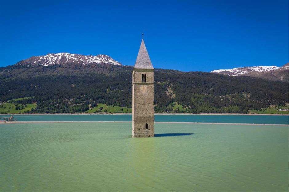 Dieses Bild scheint aus einem Märchen zu stammen, so unwirklich ragt der Turm der alten Pfarrkirche von 1355 aus dem Reschensee empor. 1950 war genau dieses Szenario jedoch der Albtraum von 150 Familien, die im Dörfchen Graun lebten. Der Ort wurde absichtlich geflutet, um einen Stausee zu schaffen. Die Bewohner mussten sich ein neues Zuhause suchen.