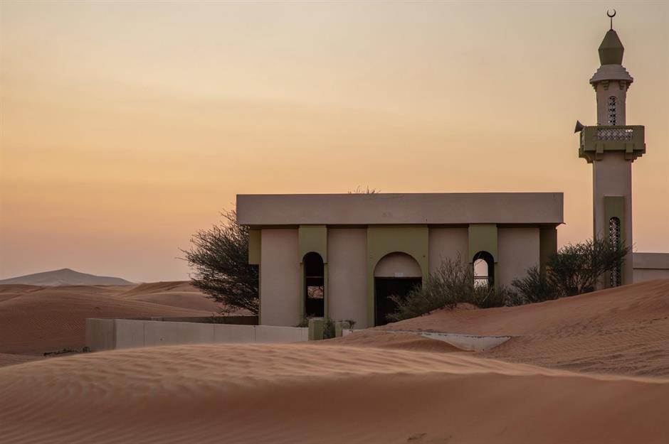 Die Vereinigten Arabischen Emirate stehen für hohe Wolkenkratzer und Luxusboulevards, doch dieses Bild erzählt eine andere Geschichte. Die Moschee mit angrenzender Villa, die sich in der Nähe von Al-Madam in Sharjah an der Straße E44 Richtung Dubai befindet, wurde Opfer einer sich wandelnden Gesellschaft.
