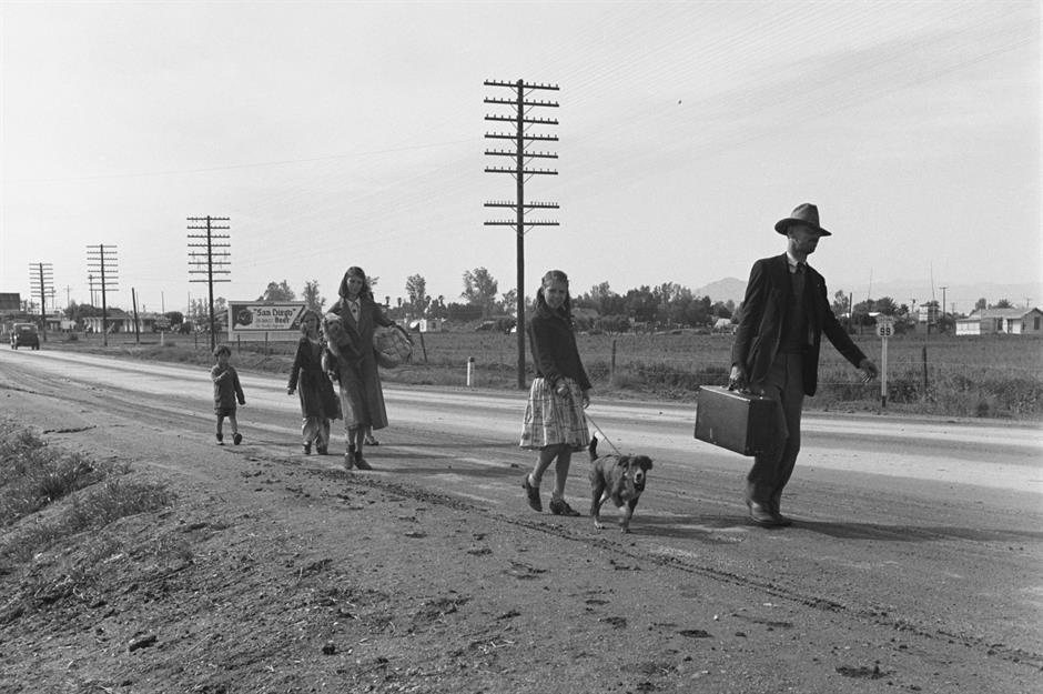 Between 1935 and 1940, a quarter of a million Oklahomans travelled 1,300 miles (2,100km) to California, but they didn’t get a very warm welcome. Many settled in the San Joaquin Valley in search of agricultural work, but competition for jobs was intense and many ended up in tents and shantytowns. 'Okies' soon became a derogatory term for any poor migrants making their way to California, like this family of cotton pickers walking by the side of a highway from Phoenix, Arizona to San Diego.