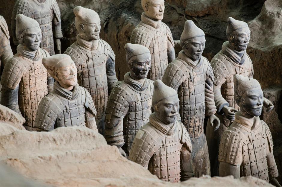 Beim Graben auf seinem Land im zentralchinesischen Xi'an entdeckte ein Bauer 1974 zu seinem Erstaunen menschliche Figuren aus Terrakotta. Die dann eintreffenden Archäologen förderten eine Statue nach der anderen zutage. Die Arbeiten sind noch nicht abgeschlossen, doch es wird geschätzt, dass die verborgene Armee aus 8.000 Soldaten, 130 Streitwagen, 520 Pferden und 150 Reitern besteht. Jede der Figuren ist einzigartig, mit individuellen Gesichtern und Körpern, und sie tragen hochentwickelte Armbrüste und Schwerter.