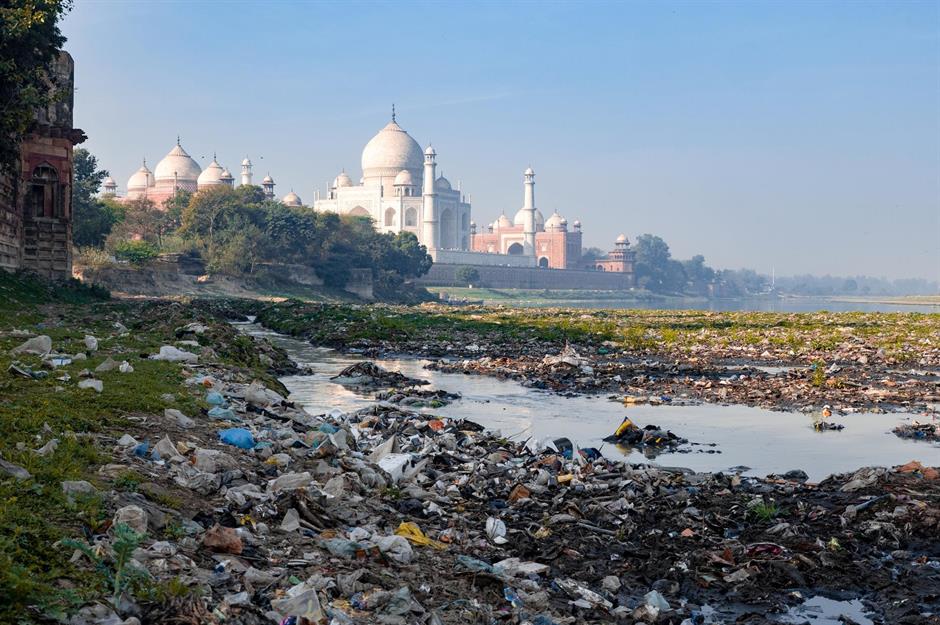 Esta vista del Taj Mahal reflejado en el río Yamuna, lleno de basura, no es lo que la mayoría de los turistas esperan. Uno de los ríos más sagrados de la India, que fluye junto al edificio más famoso del país, sufre desde hace tiempo una grave contaminación. Los residuos son un grave problema en todo el país, con muchos de sus ríos y cuerpos de agua atascados de botellas, bolsas y envases de plástico, mientras que las calles están repletas de bolsas de basura. Las condiciones del Yamuna eran tan malas en 2021 que el río desarrolló una espuma blanca tóxica en su superficie, causada por una combinación nociva de aguas residuales y residuos industriales.