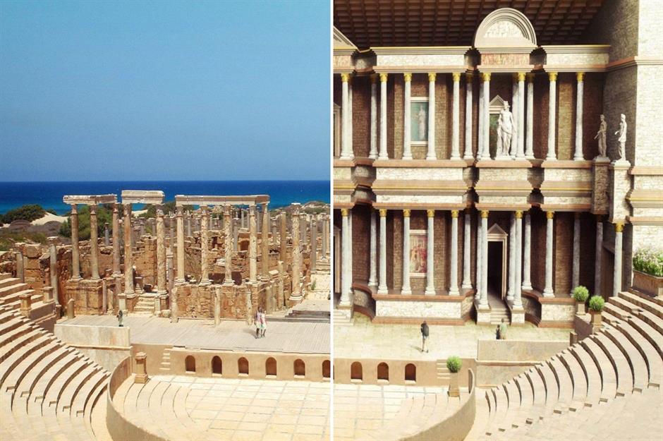 Aún pueden verse vestigios de la antigua gloria de la ciudad en sus bellas ruinas romanas, como el gran anfiteatro (reimaginado aquí), su teatro del siglo I financiado por ricos aristócratas y el hipódromo (o circo), una pista de carreras de unos 460 m de longitud construida en el siglo II. En el corazón de Leptis Magna se encuentran los restos de su mercado, la estructura más reciente construida durante el gobierno del emperador Septimio Severo (193-211 a.C.), que nació en la ciudad y fue uno de sus mayores mecenas.