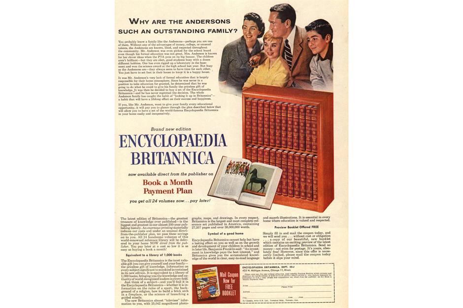 The Encyclopedia Britannica had been published in the US since 1901, but the 1950s saw the company make a concerted effort to get into the homes of aspirational families. They promised the "equivalent of a library of 1,000 books" in the form of 24 handsomely bound volumes.