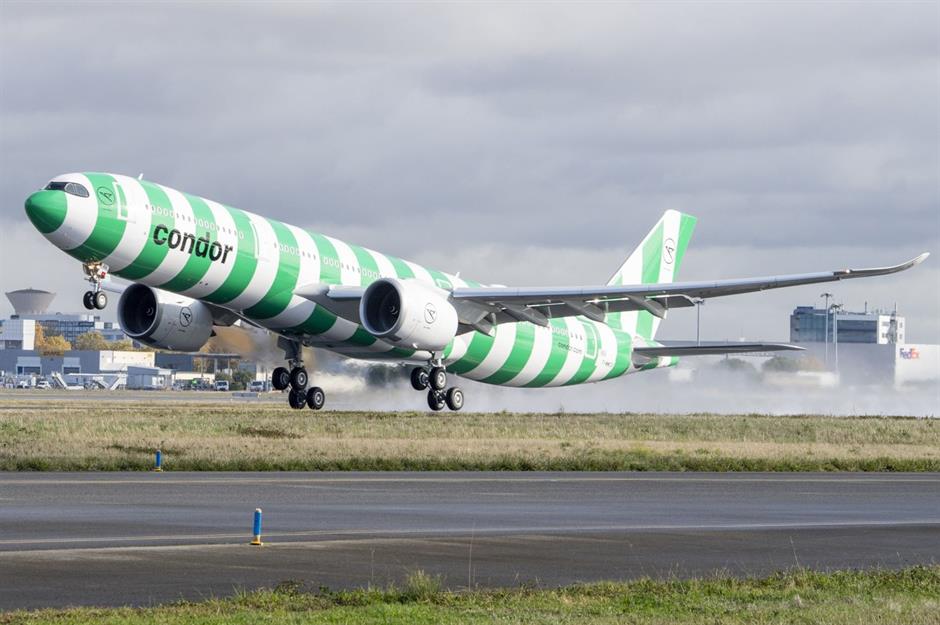 Beim deutschen Ferienflieger Condor (im Bild) ist der A330neo nach eigenen Angaben mit einem Verbrauch von 2,1 Litern auf 100 Kilometern unterwegs. Dadurch würden 20 Prozent weniger CO₂-Emissionen als zuvor auf derselben Strecke entstehen. Sogenannte Sharklets (gebogene Flügelspitzen) an den Tragflächen und eine weitere Spannbreite (64 Meter) tragen zur verbesserten Aerodynamik des Flugzeugs bei.