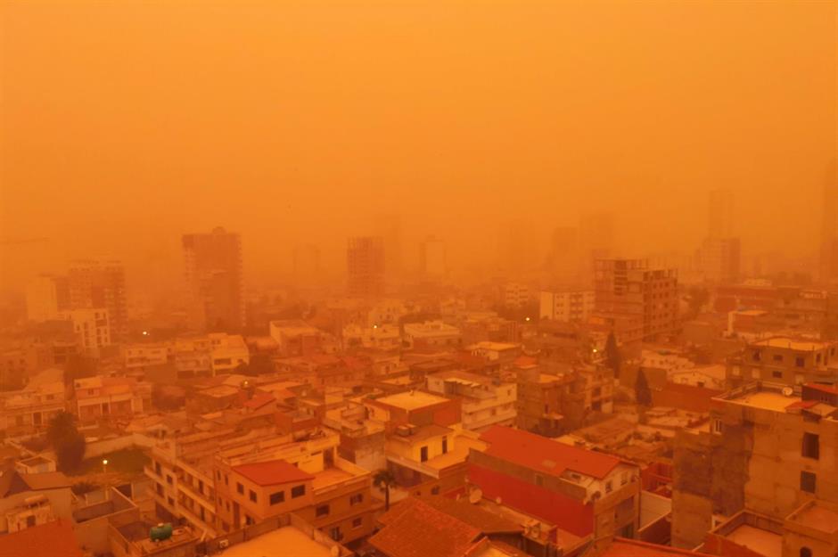 Los cielos se tiñeron de rojo brillante sobre Argelia en febrero de 2021 como consecuencia de una intensa tormenta de arena. La arena fue levantada del desierto del Sahara por fuertes vientos, antes de viajar a Argelia y luego hacia el norte, a las cadenas montañosas europeas, incluidos los Pirineos y los Alpes. Aunque las tormentas de arena son un fenómeno natural, las condiciones de sequía provocadas por el cambio climático las están haciendo más frecuentes e intensas.