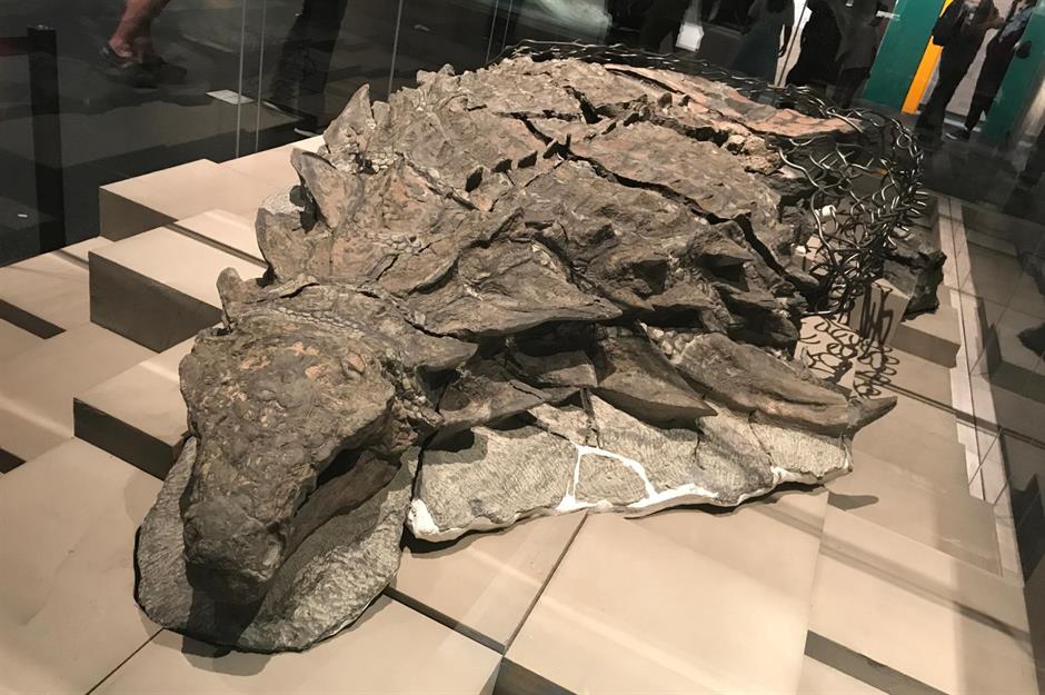 Diese fast niedlich wirkende Kreatur scheint in einem ewigen Dämmerschlaf zu verharren. Sie wurde 2011 in einer Mine im kanadischen Alberta entdeckt, als ein Baggerfahrer versehentlich einen Teil seiner versteinerten Haut ausgrub. Es stellte sich heraus, dass es sich bei diesem Fund um einen gepanzerten Nodosaurus, einem Mitglied der Ankylosaurus-Familie, handelte.