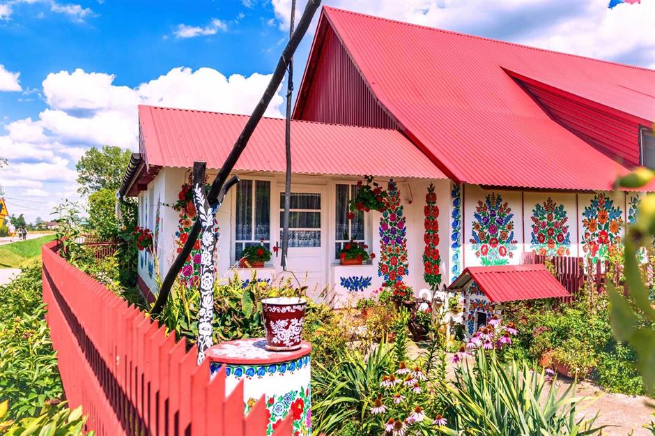 Das hübsche Dörfchen Zalipie in Südpolen birgt ein Geheimnis: Schon im 19. Jahrhundert verwendeten Frauen hier eine Mischung aus Farbpulver und Milch, um schmutzige Stellen an den Häusern zu übermalen. Diese Tradition hat sich bis heute gehalten und mittlerweile sind mehr als 30 Häuser in Zalipie mit kunstvollen Blumenmustern geschmückt. Einige der Häuser können heute als Museen besichtigt werden, andere befinden sich in Privatbesitz.
