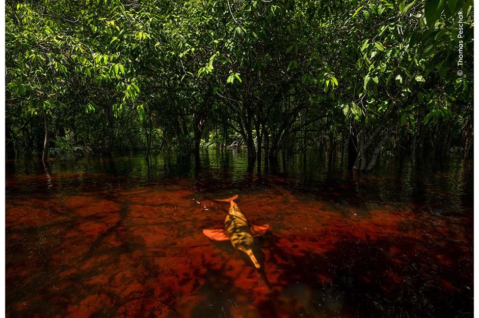 Observando cómo los reptiles luchaban entre sí, Aigner tomó esta fotografía, que ganó el premio Behaviour: Amphibians and Reptiles (‘Comportamiento: Anfibios y Reptiles’). Los caimanes comen serpientes, pero, a medida que las anacondas crecen, también incluyen reptiles en su dieta, por lo que es difícil determinar quién es el agresor aquí.