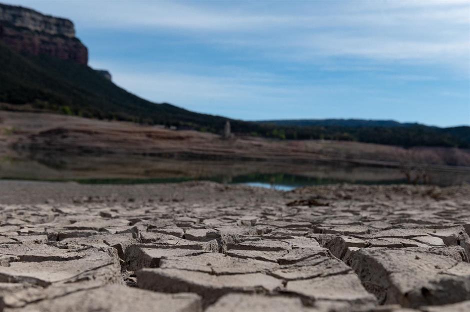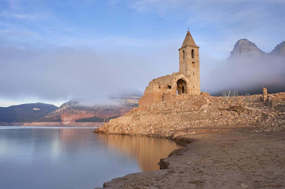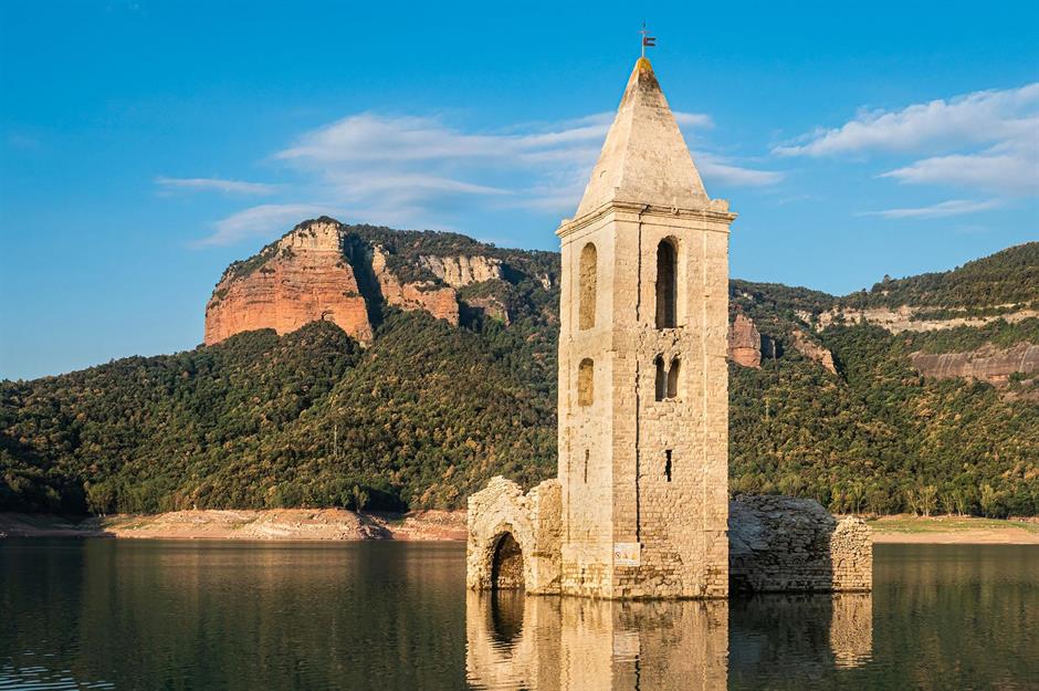 Die romanische Kirche, die 1062 geweiht wurde, wurde in den 1960er-Jahren im Zuge eines Dammbaus absichtlich überflutet. Allerdings kämpft Spanien seit 2022 mit einer schweren Dürre, die im ganzen Land zu Notmaßnahmen geführt hat. Der Sau-Stausee – eine der wichtigsten Wasserquellen der Region – erreichte einen Rekordtiefstand und war über weite Strecken fast komplett ausgetrocknet.