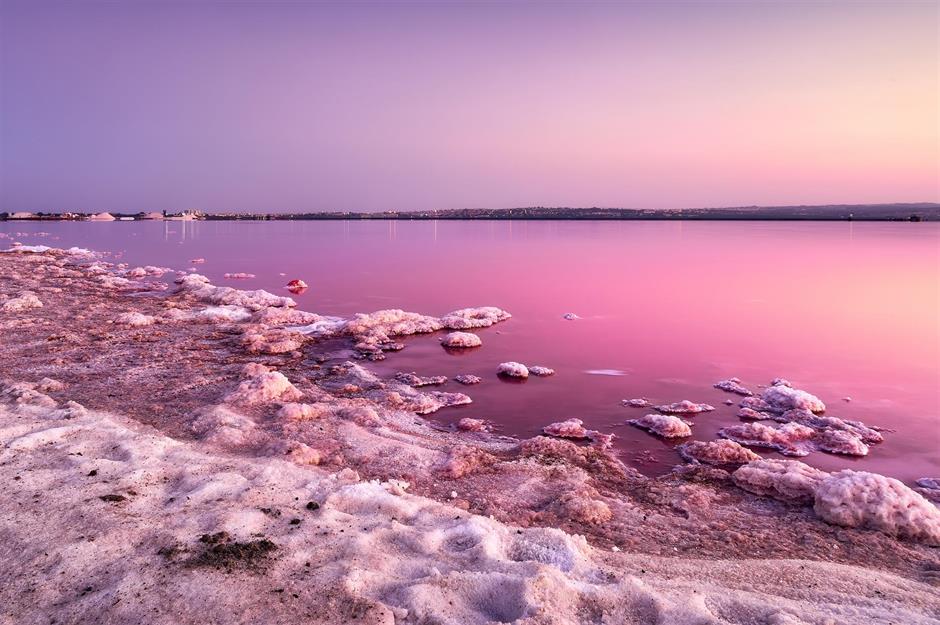 Las Salinas de Torrevieja, en España, son famosas por sus aguas rosadas, causadas por algas y bacterias amantes de la sal. Aunque el color es más vivo en condiciones soleadas y secas, su intensidad puede variar según la estación. Los visitantes también pueden flotar sin esfuerzo en sus aguas saladas, similares a las del Mar Muerto.