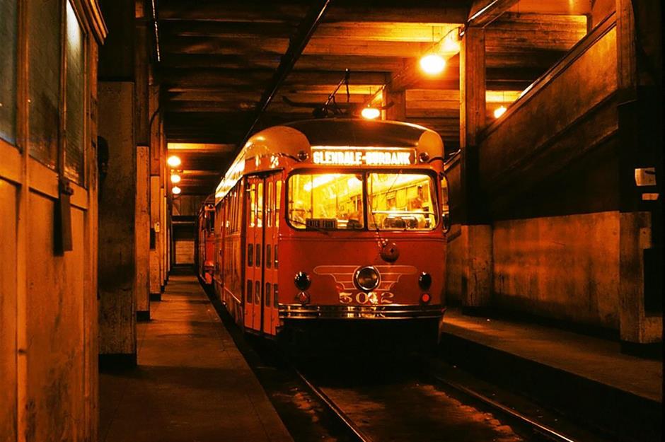 Aquí vemos una estación eléctrica abandonada que una vez alimentó el metro. Bajo la superficie, las vías, las plataformas e incluso la señalización del sistema de metro Red Car todavía están intactas, pero permanecen fuera del alcance de los visitantes.