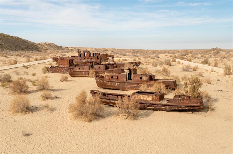 In den 2010er-Jahren bestätigten Satellitenbilder, dass der See fast ausgetrocknet war – zurück blieb eine wüste Einöde und ein Schiffsfriedhof (im Bild).
