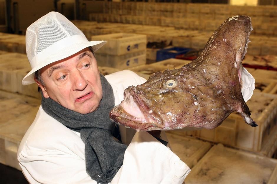Sie haben riesige Mäuler und hervorquellende Augen, aber für Gourmets gilt ihr festes, hummerähnliches Fleisch als Delikatesse. Fast hat man Mitleid mit Köchen wie Raymond Blanc, der hier auf einem schottischen Fischmarkt einen Seeteufel hält – immerhin muss er ihn zubereiten.