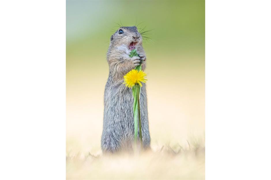 Cet adorable écureuil terrestre (dénommé localement « ziesel ») a l’air d’être en pleine performance musicale. Il utilise même une fleur comme micro !