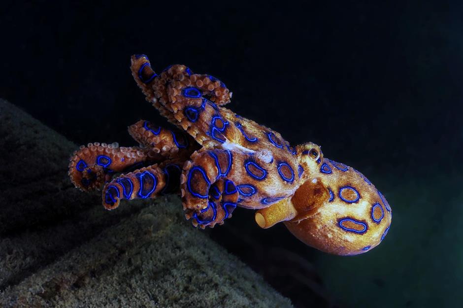La pieuvre aux anneaux bleus entre dans la catégorie des créatures envoûtantes mais extrêmement dangereuses (tout comme les oursins-fleurs). Ses motifs spectaculaires d’un bleu électrique, qui apparaissent lorsqu’elle se sent menacée, avertissent surtout ses prédateurs, mais souvent trop tard. Présente en Asie du Sud-Est et le long de la côte australienne, sa morsure indolore entraîne une insuffisance respiratoire et la mort en quelques minutes, sans aucun antidote disponible. Le pire ? Les victimes demeurent généralement conscientes à mesure que la toxine les paralyse.