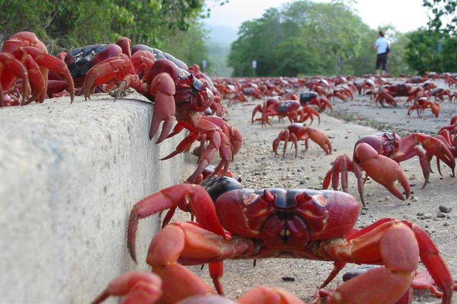 Au début de la saison humide (généralement en octobre ou novembre), les crabes de l’île se déplacent en masse de la forêt vers la côte pour se reproduire et relâcher leurs œufs dans la mer. Des nuées de crabes rouges, endémiques à l’île Christmas, recouvrent littéralement l’île.
