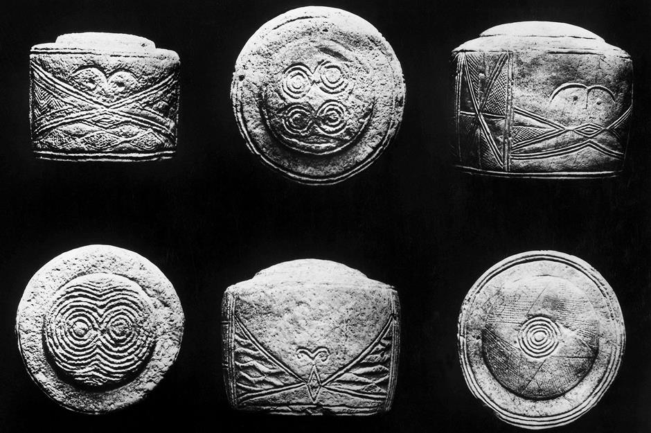 Seit ihrer Entdeckung im Jahr 1889 bereiten diese reich verzierten Trommeln aus Kalkstein den Historikern Kopfzerbrechen. Sie sind etwa 5.000 Jahre alt und wurden in einem Grab im Nordosten von England gefunden. Sind es Vorratsgefäße, oder geben die geometrischen Muster einen Hinweis auf eine astronomische Bedeutung? Bis heute sind sich Experten uneinig.