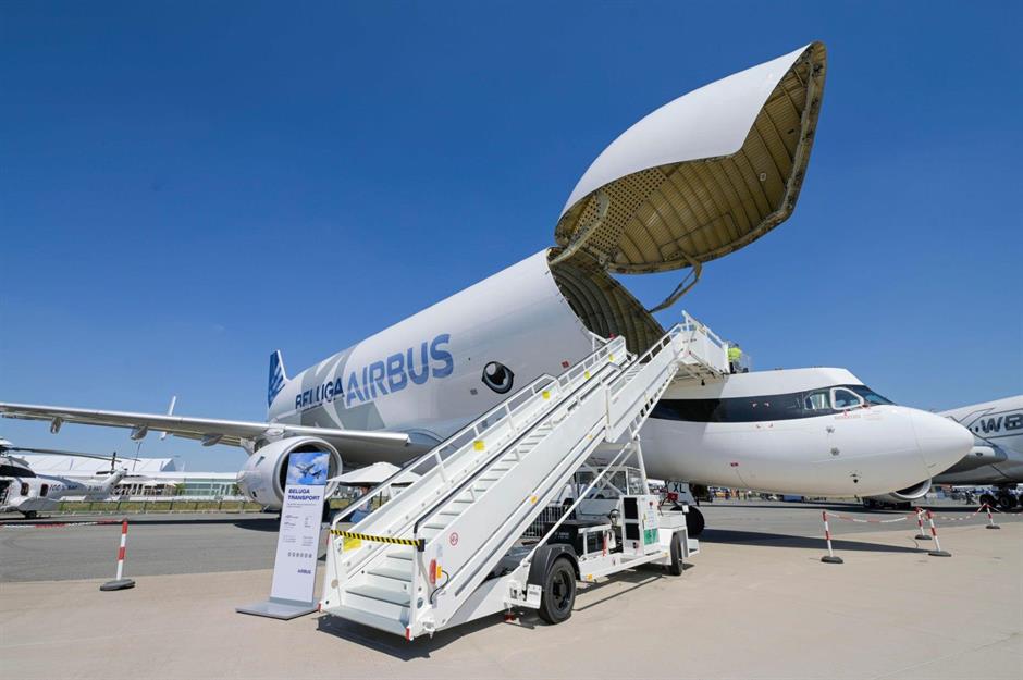 Die Nase des Flugzeugs öffnet sich für einfacheres Beladen nach oben. Dieses innovative Design wurde inzwischen sowohl für Boeing- als auch Airbus-Flugzeuge übernommen.